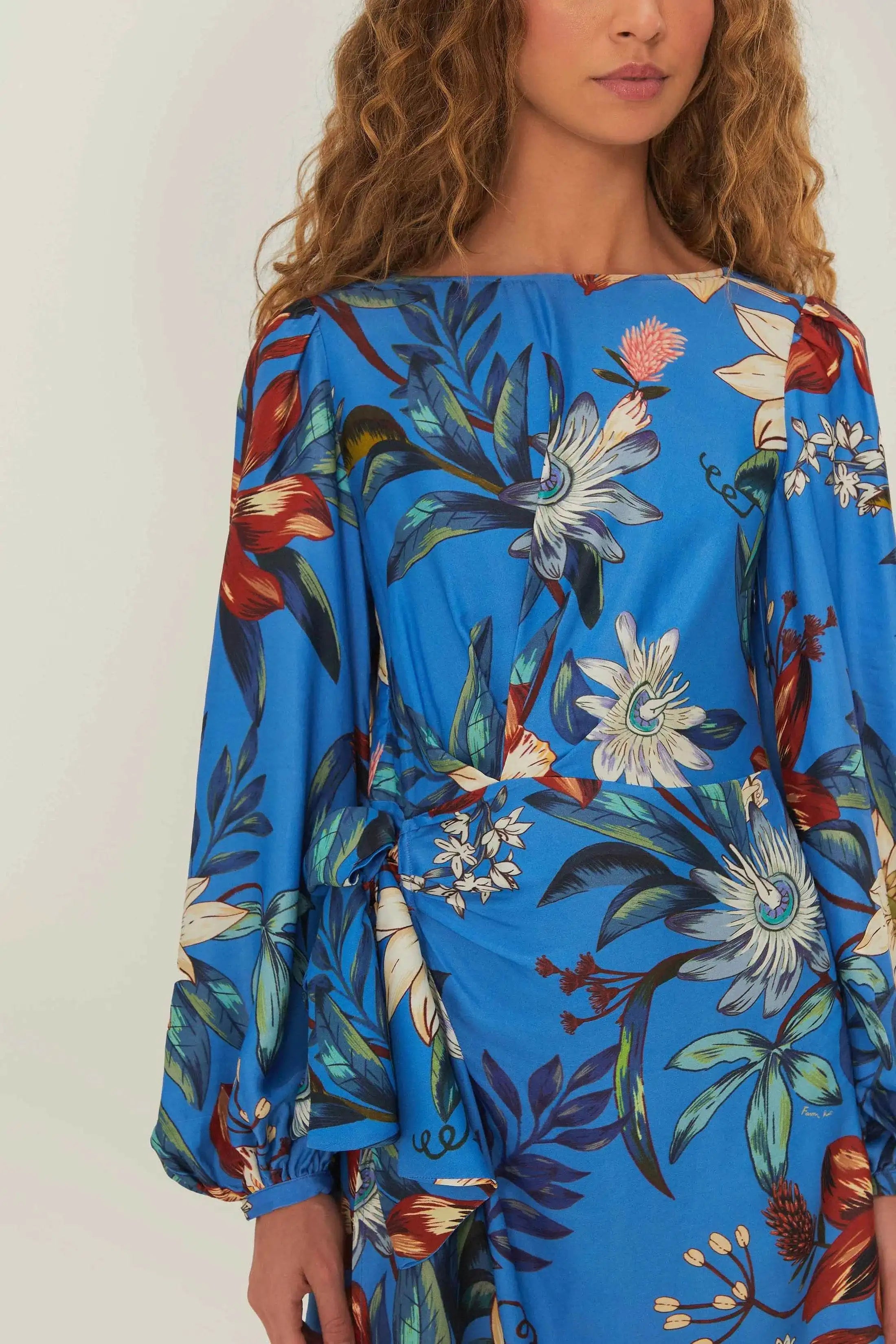 Embrace the elegance of nature with the Blue Surreal Flowers Wrap Mini Dress. Blooming with a vibrant floral print on a captivating blue backdrop, each piece boasts a flattering wrap silhouette and a round neckline. Revel in the gentle drape of bell sleeves, adding a touch of whimsy to your movements. Crafted from choice materials with a commitment to the environment, this dress is a true testament to conscious fashion with an enchanting twist. LENZING™ ECOVERO™: the eco-responsible fibers generate up to 50% lower emissions and water impact compared to generic viscose.