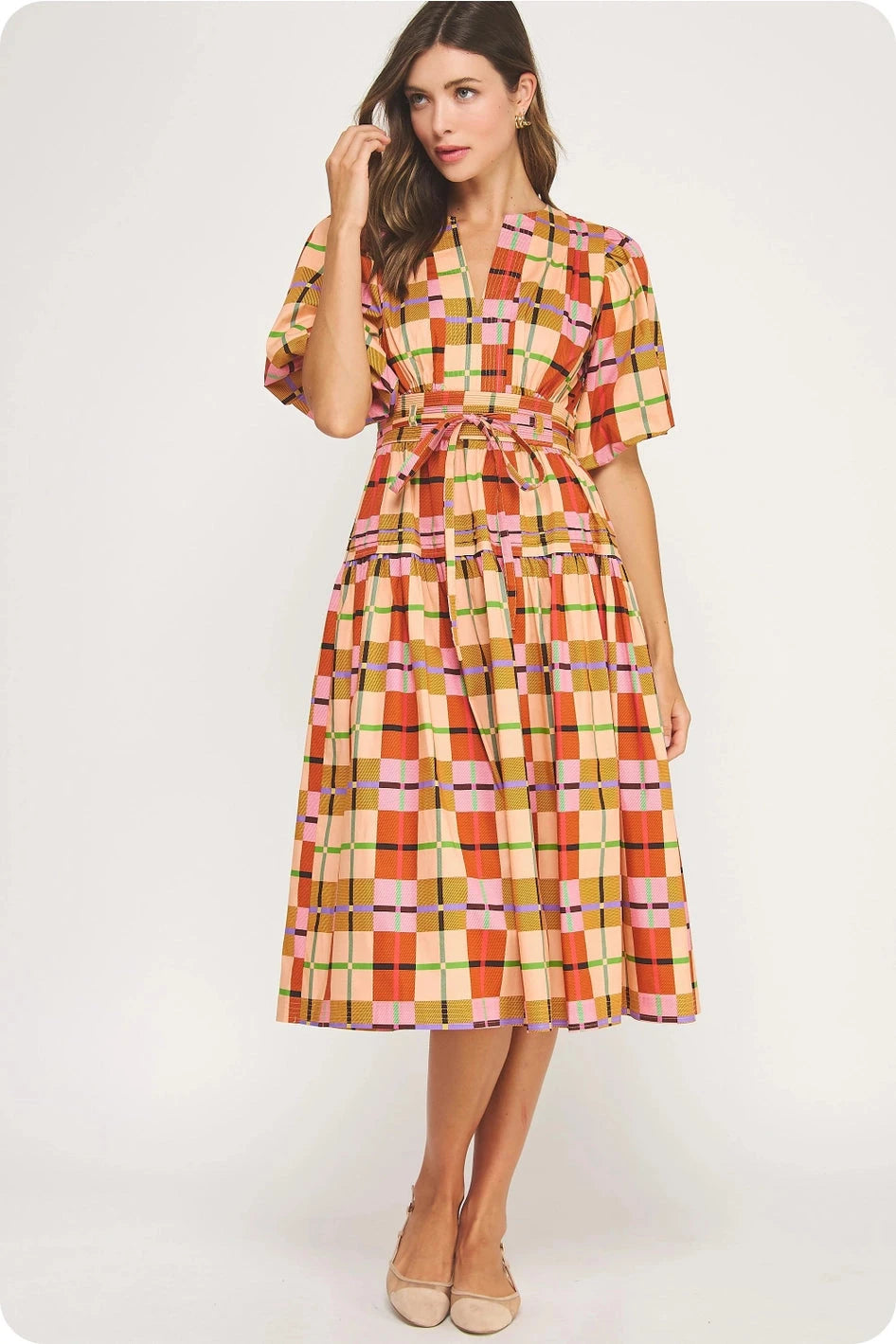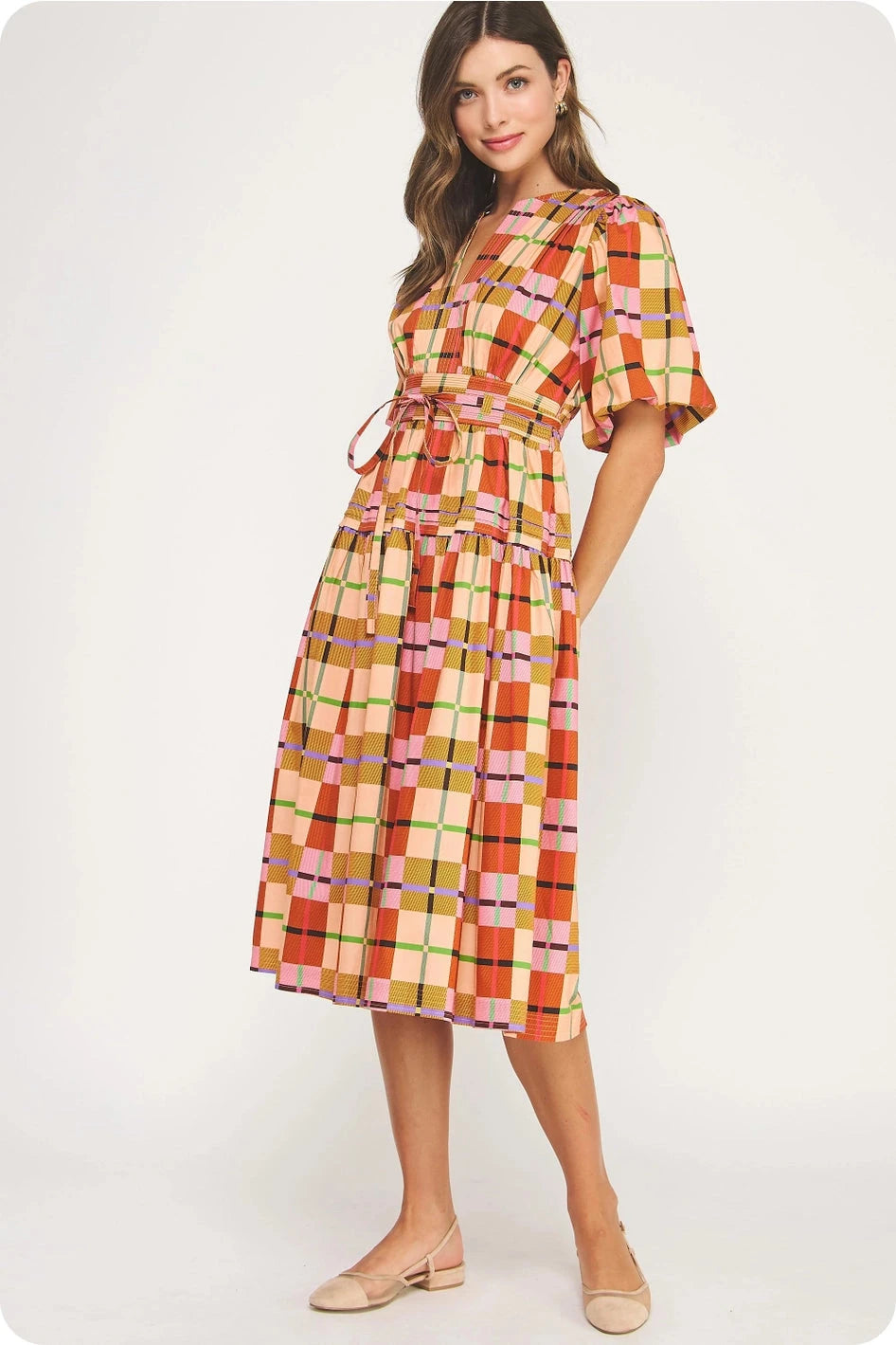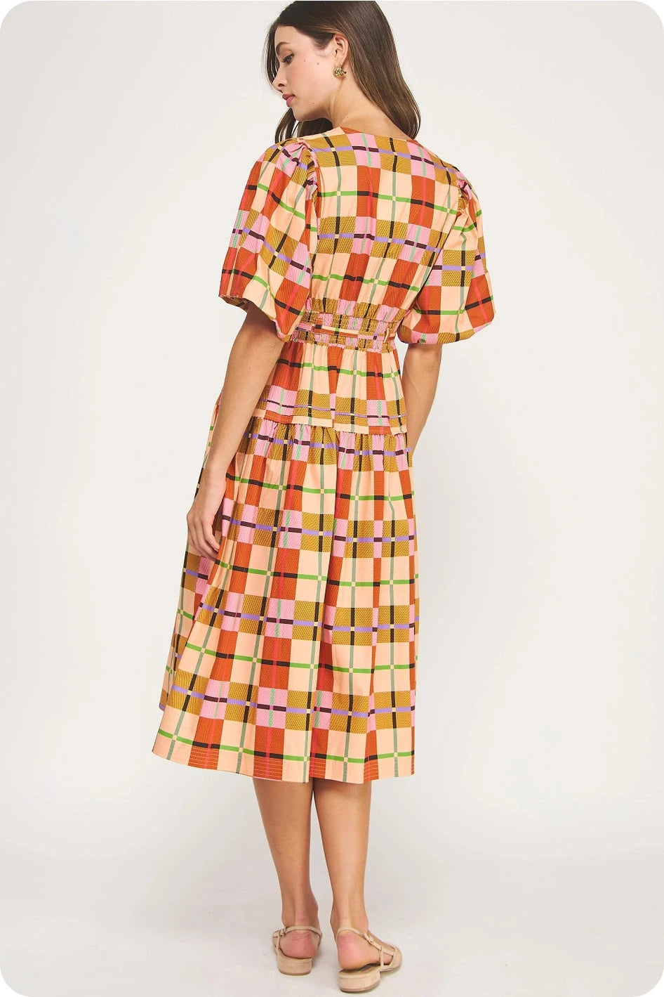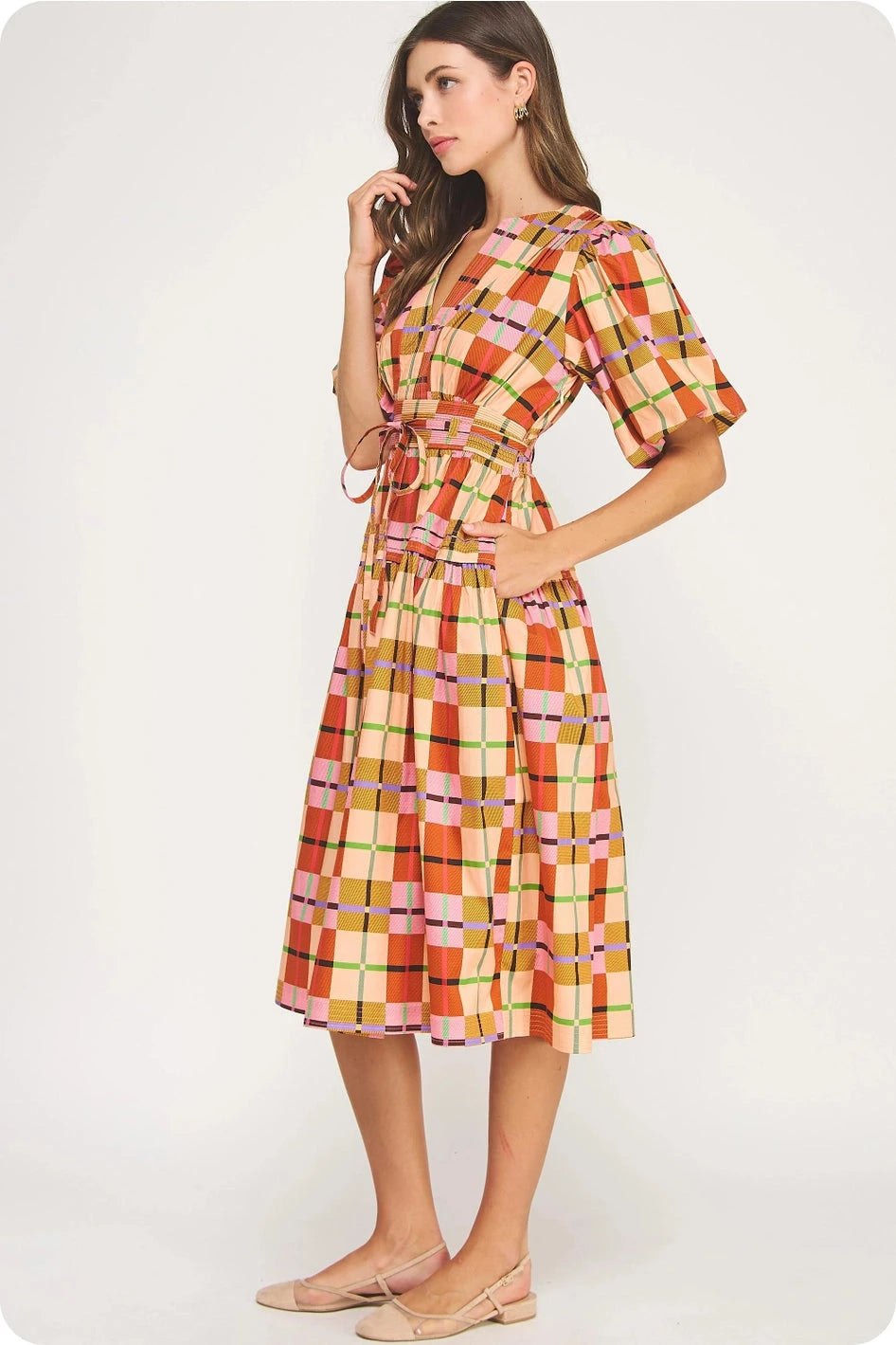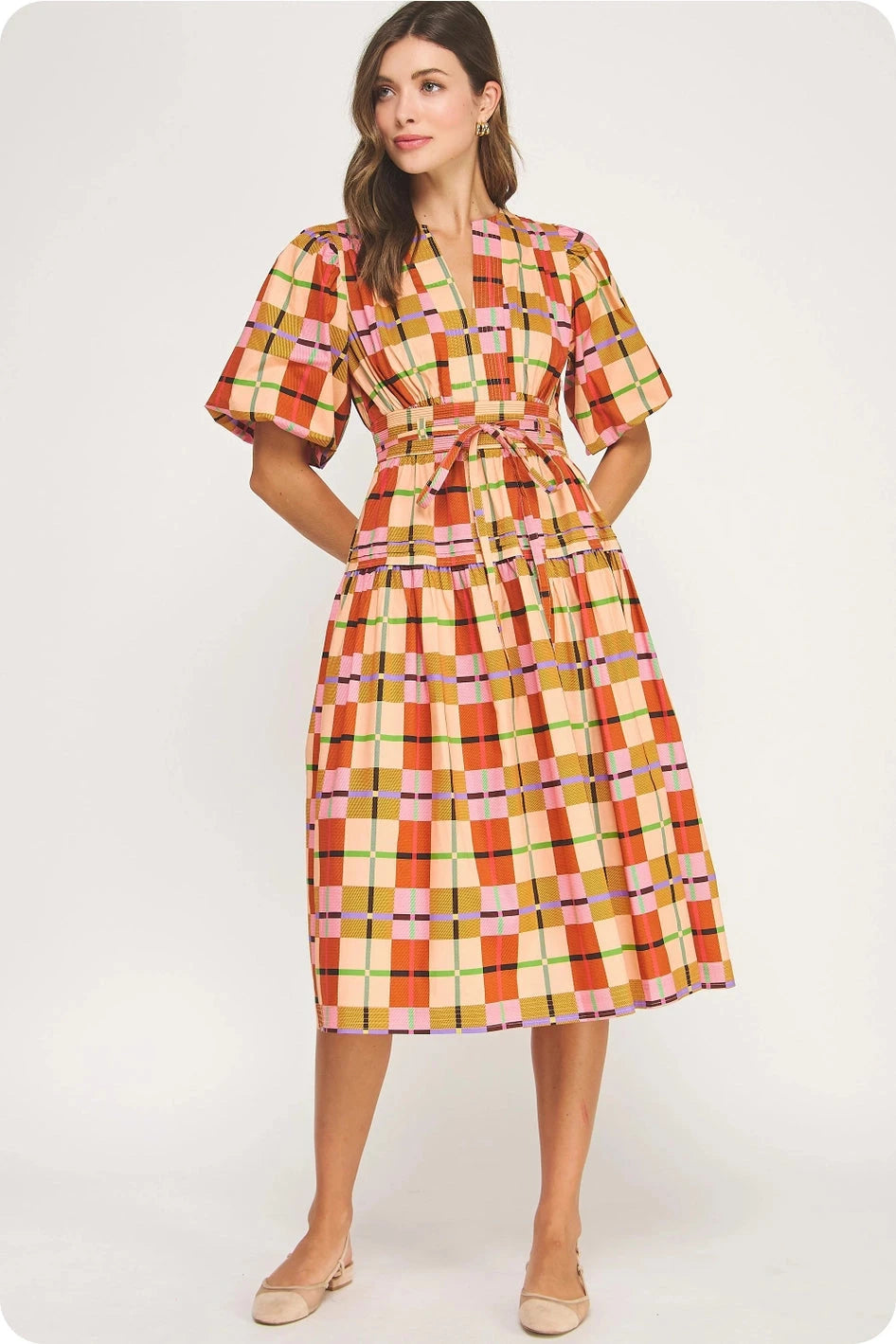 Introducing the Brightside Midi—a charming dress designed to make you feel confident and comfortable. This exclusive plaid midi features flattering puff short sleeves and a chic split V-neck that frames your face beautifully. The A-line skirt with delicate pintuck detailing creates an elegant silhouette, while practical side pockets keep your essentials close. A removable waist tie and stretch smock back allow you to customize the fit to suit your body, and the side zipper closure ensures easy dressing. Crafted from quality poplin fabric, this versatile piece transitions effortlessly from day to night.