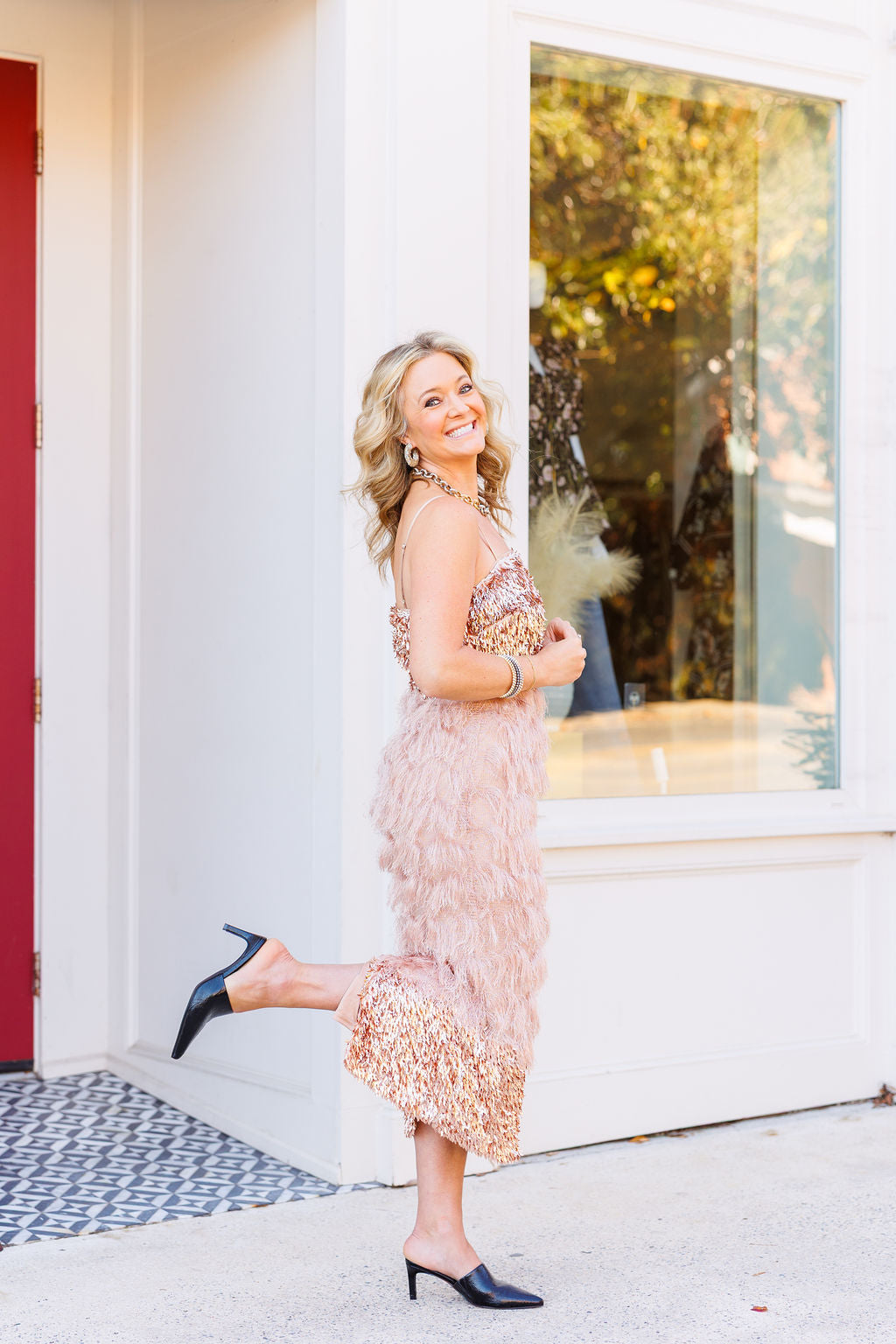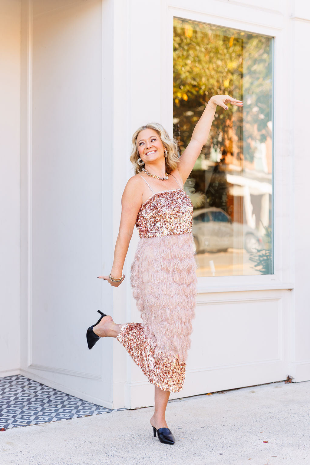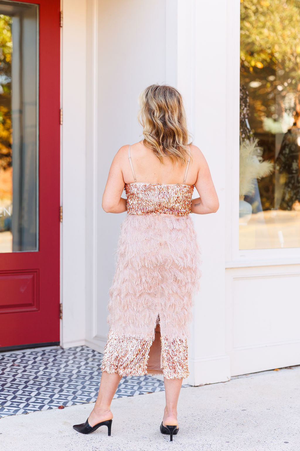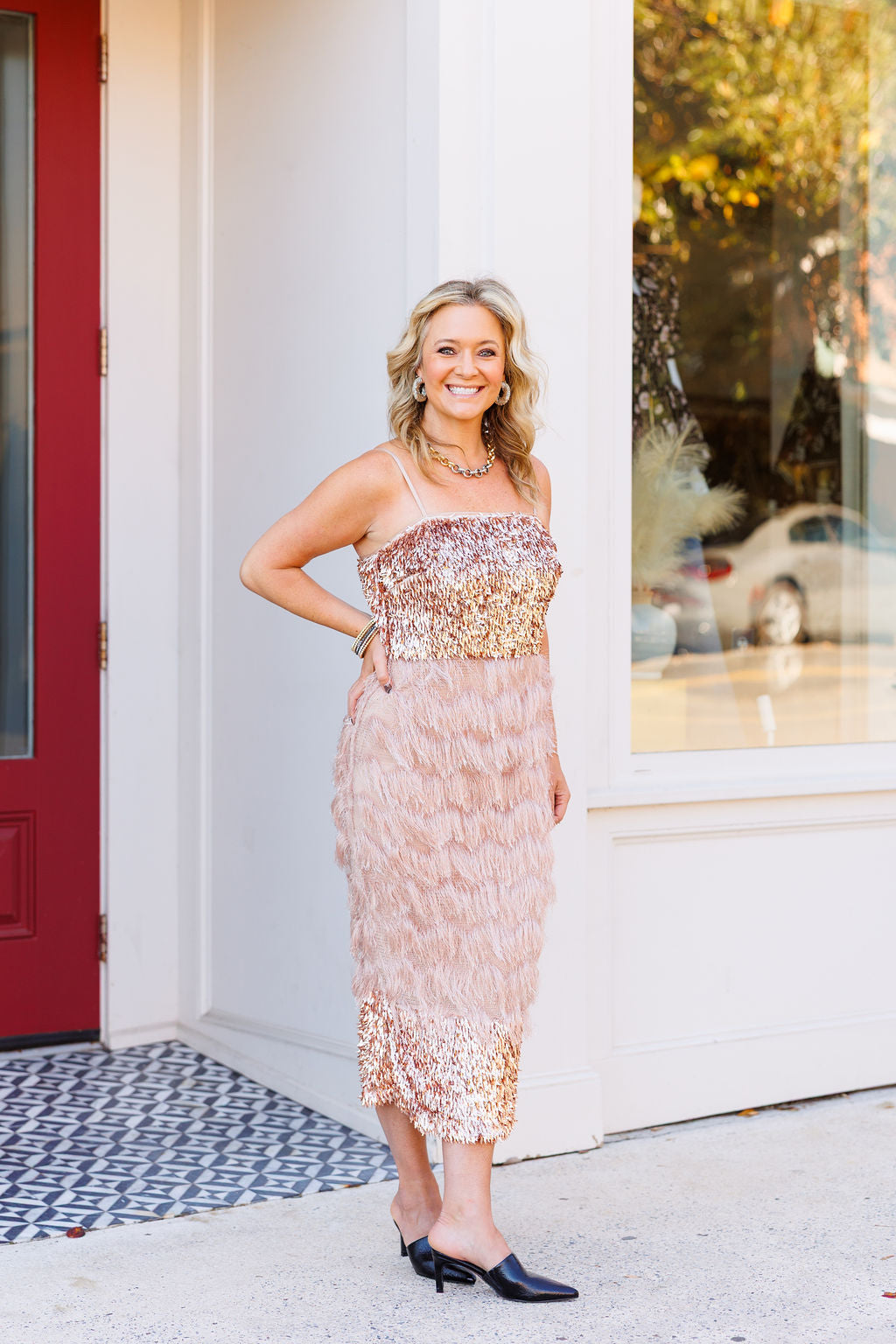 Turn heads at every celebration in the Champagne Dreams Dress — a perfect blend of shimmer and sophistication. The fitted midi skirt catches the light with every move thanks to its luxe fringe detailing, while the adjustable spaghetti strap top sparkles in soft champagne sequins. Designed with a slightly blousy fit at the bodice for an effortlessly flattering shape, this dress pairs timeless elegance with a modern edge.