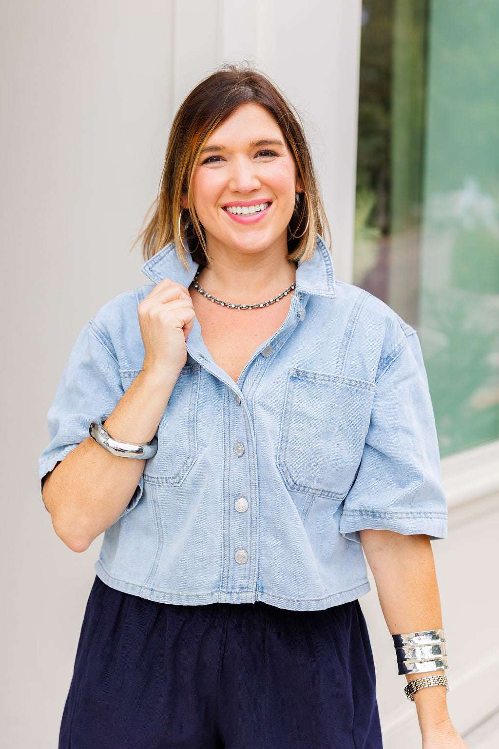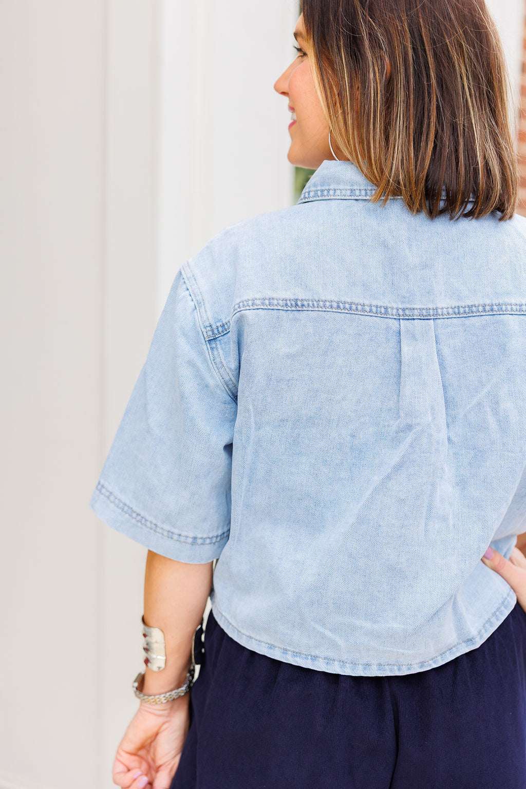 Our Everydae Denim Top is a short-sleeve button-down crafted from light-wash cropped denim, perfect for adding a classic and on-trend twist to your casual 'fits.
