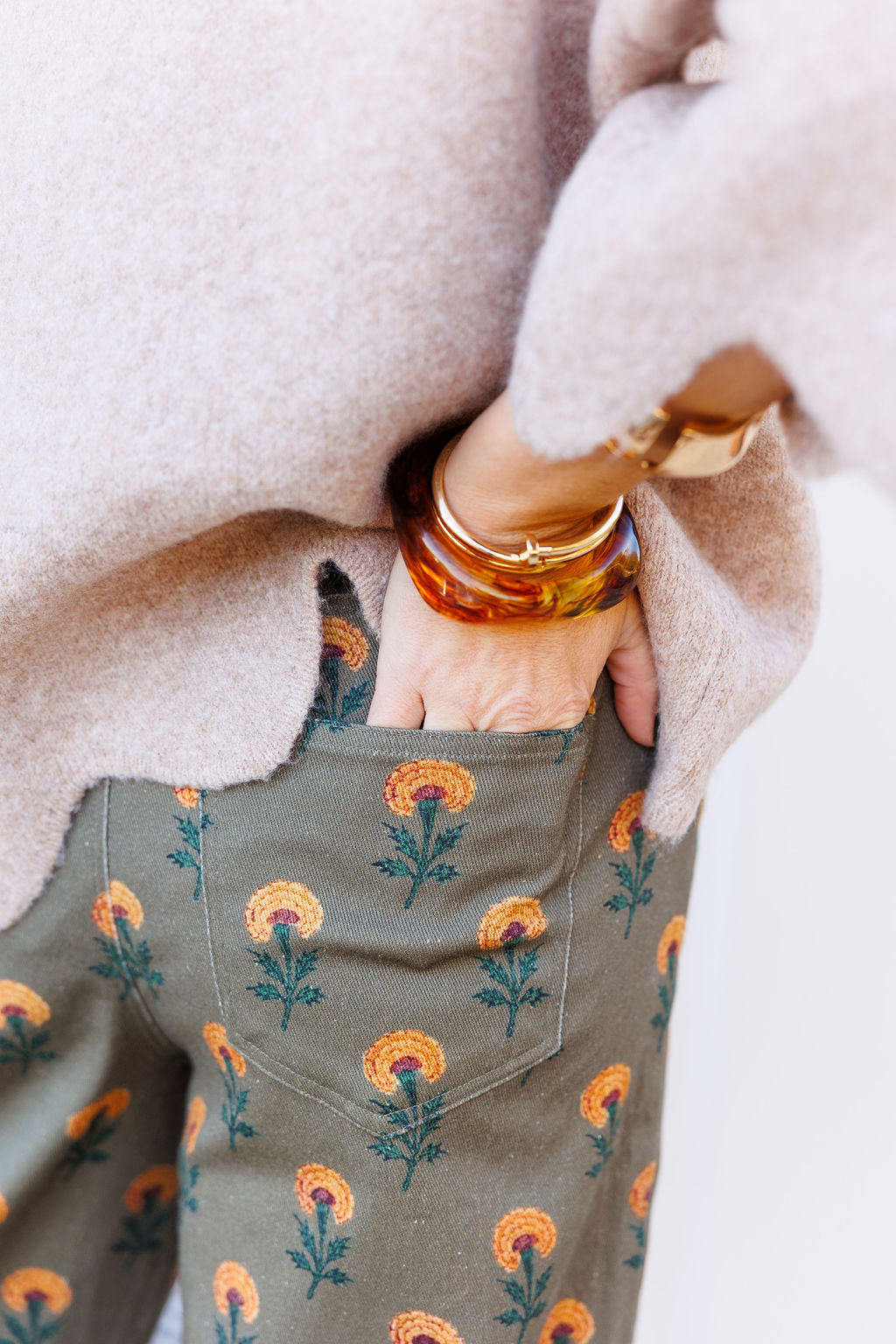 Olive denim with floral print.