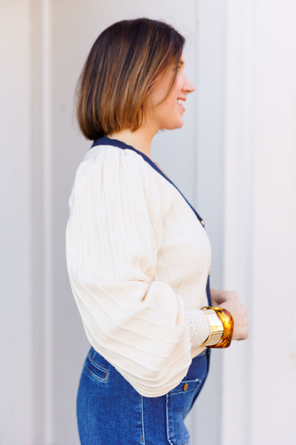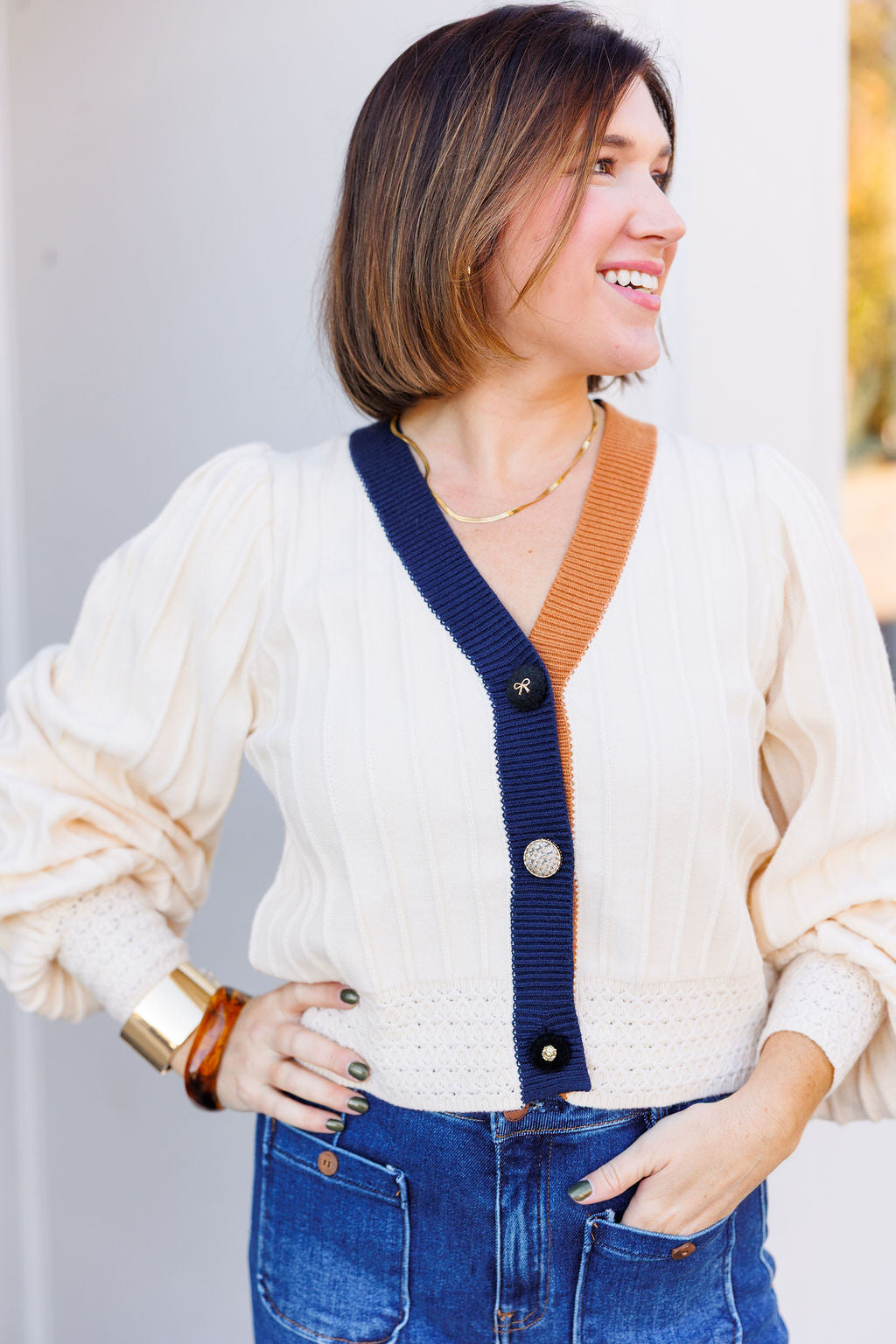 Woman wearing a cream cardigan with navy and brown trim accent and blue jeans.