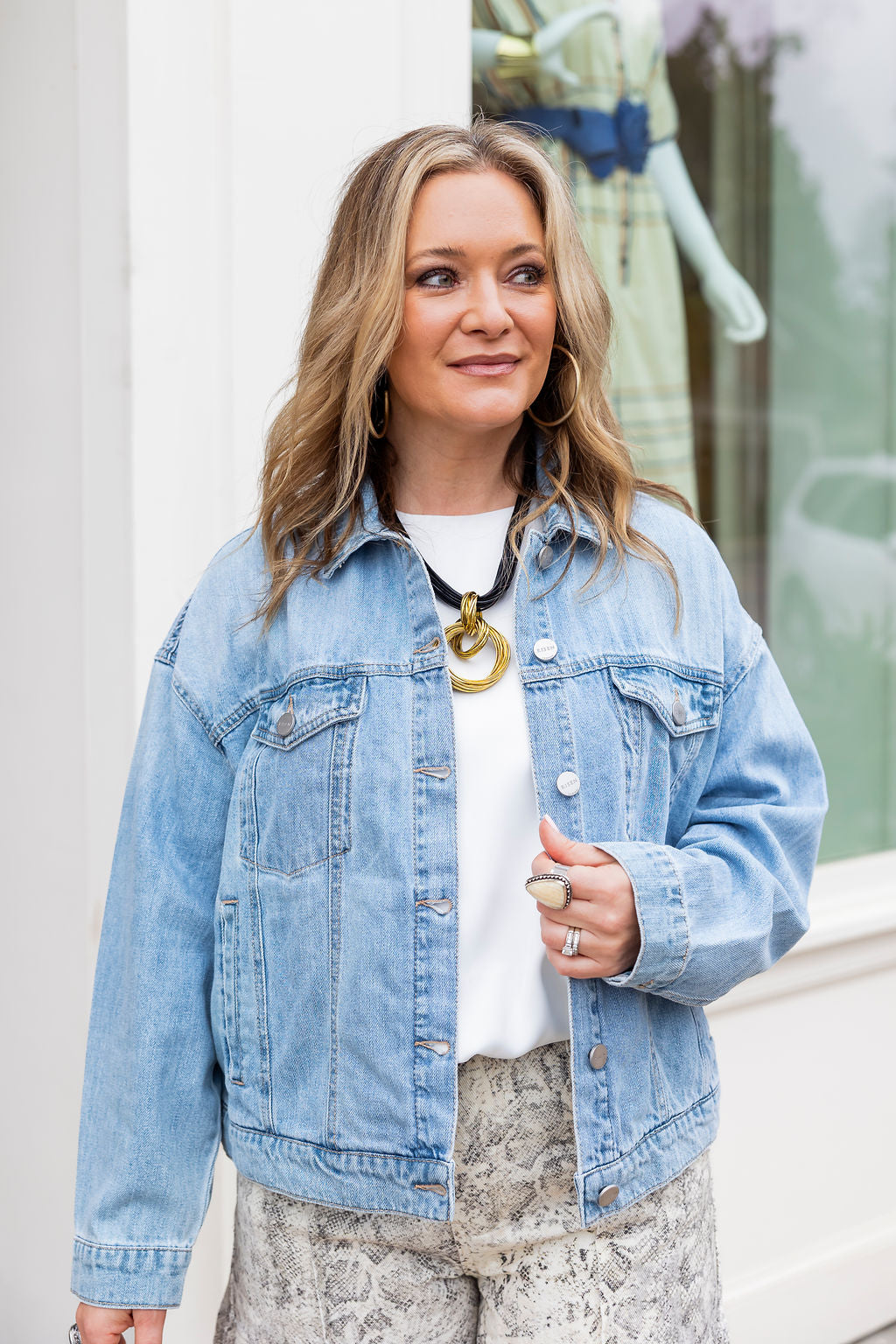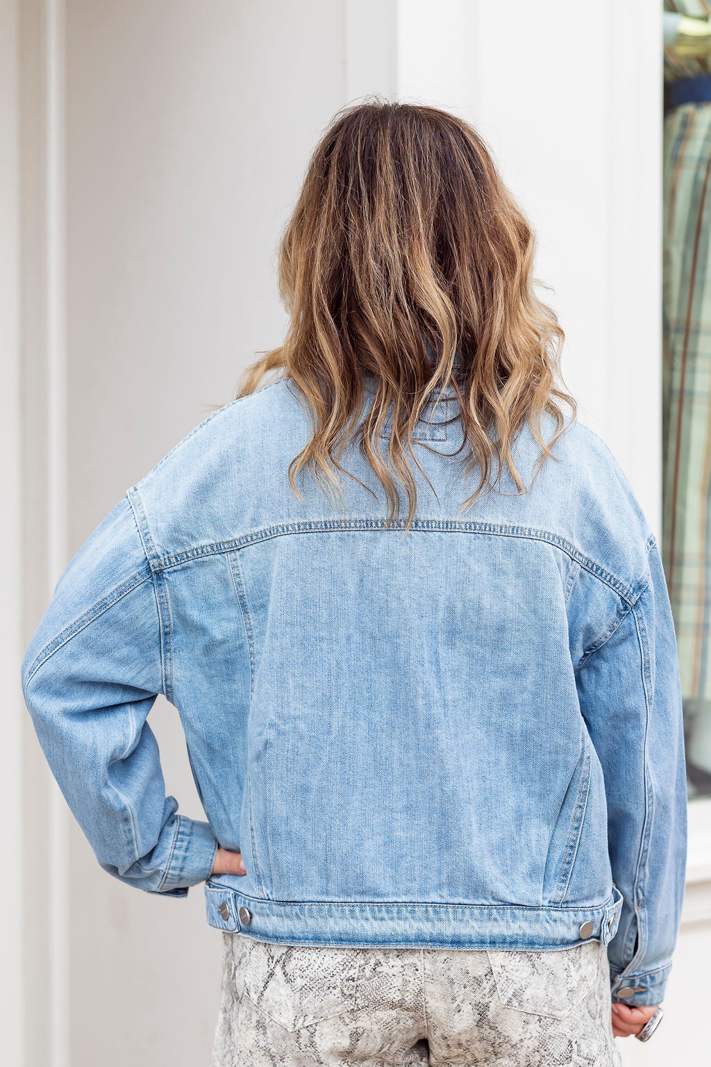 The Borrowed Denim Jacket features a relaxed, roomy silhouette in a soft light wash that feels vintage-inspired but clean and modern. It layers effortlessly over tees, knits, dresses, and athleisure — the ultimate finishing piece for everyday outfits.