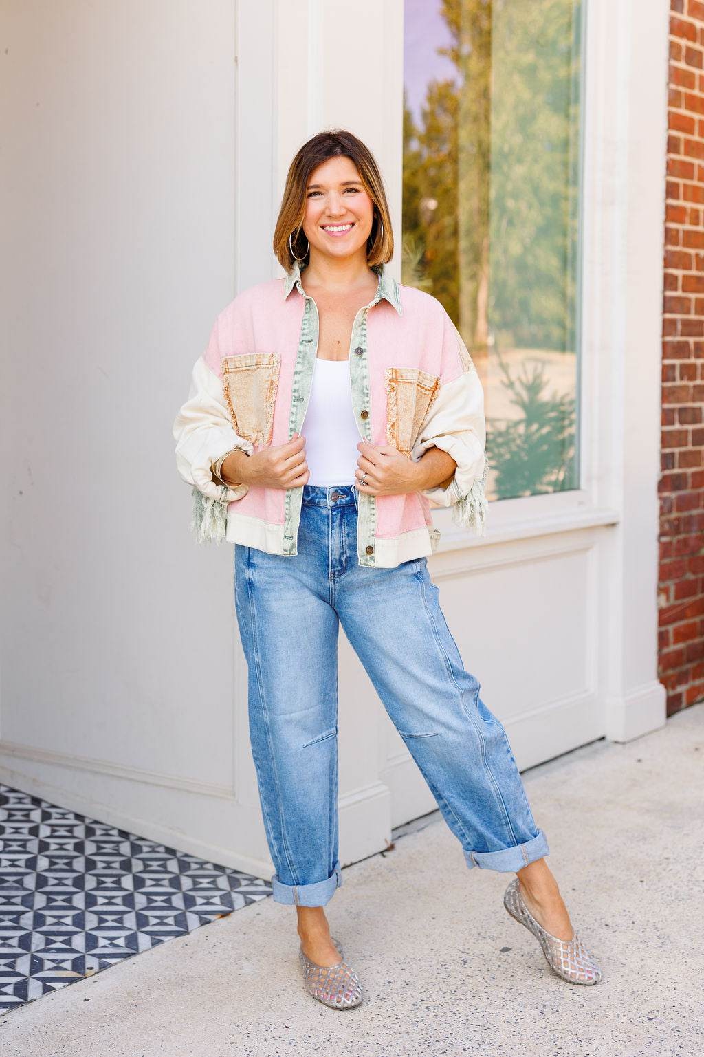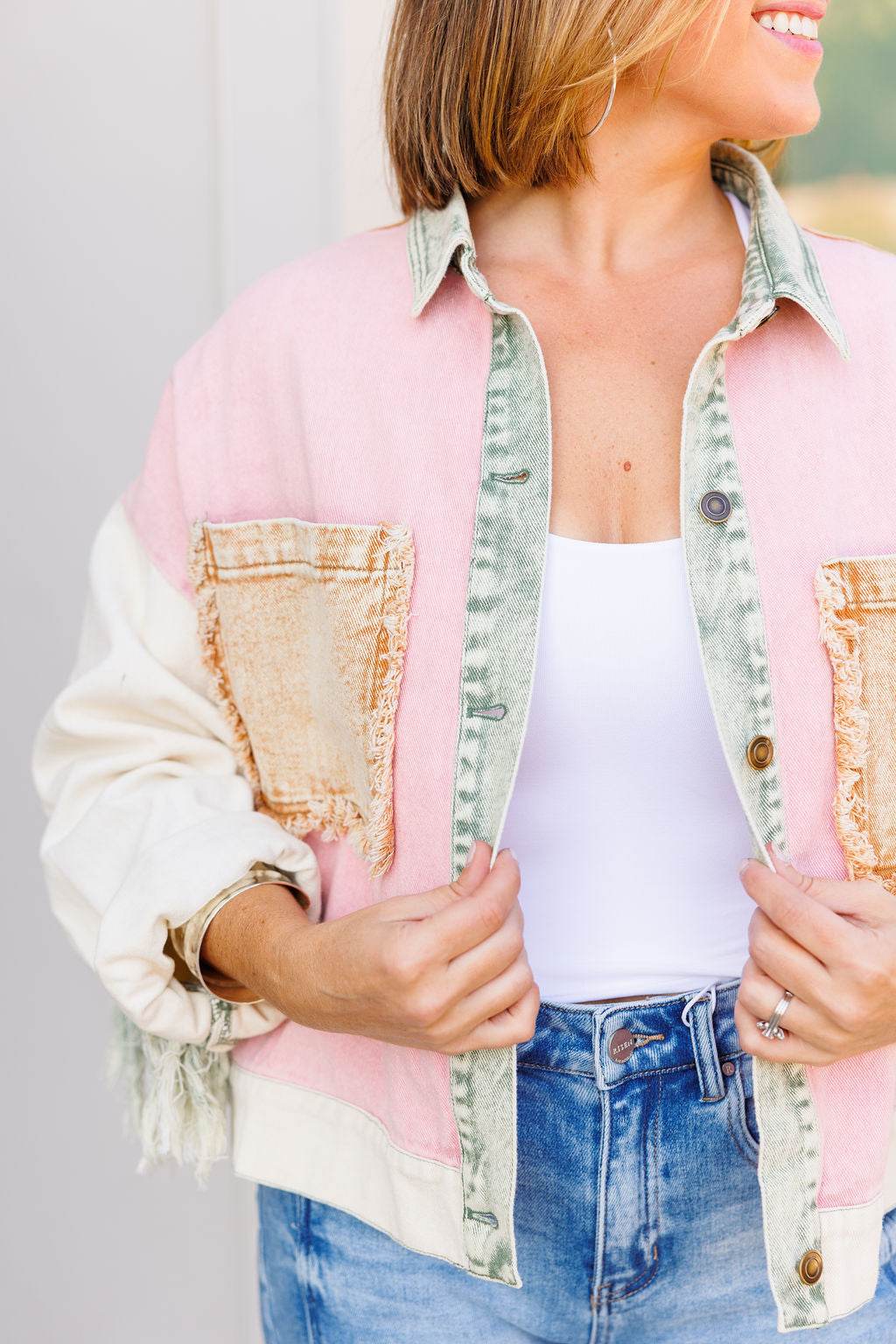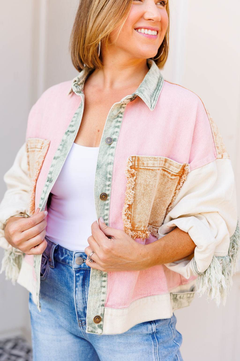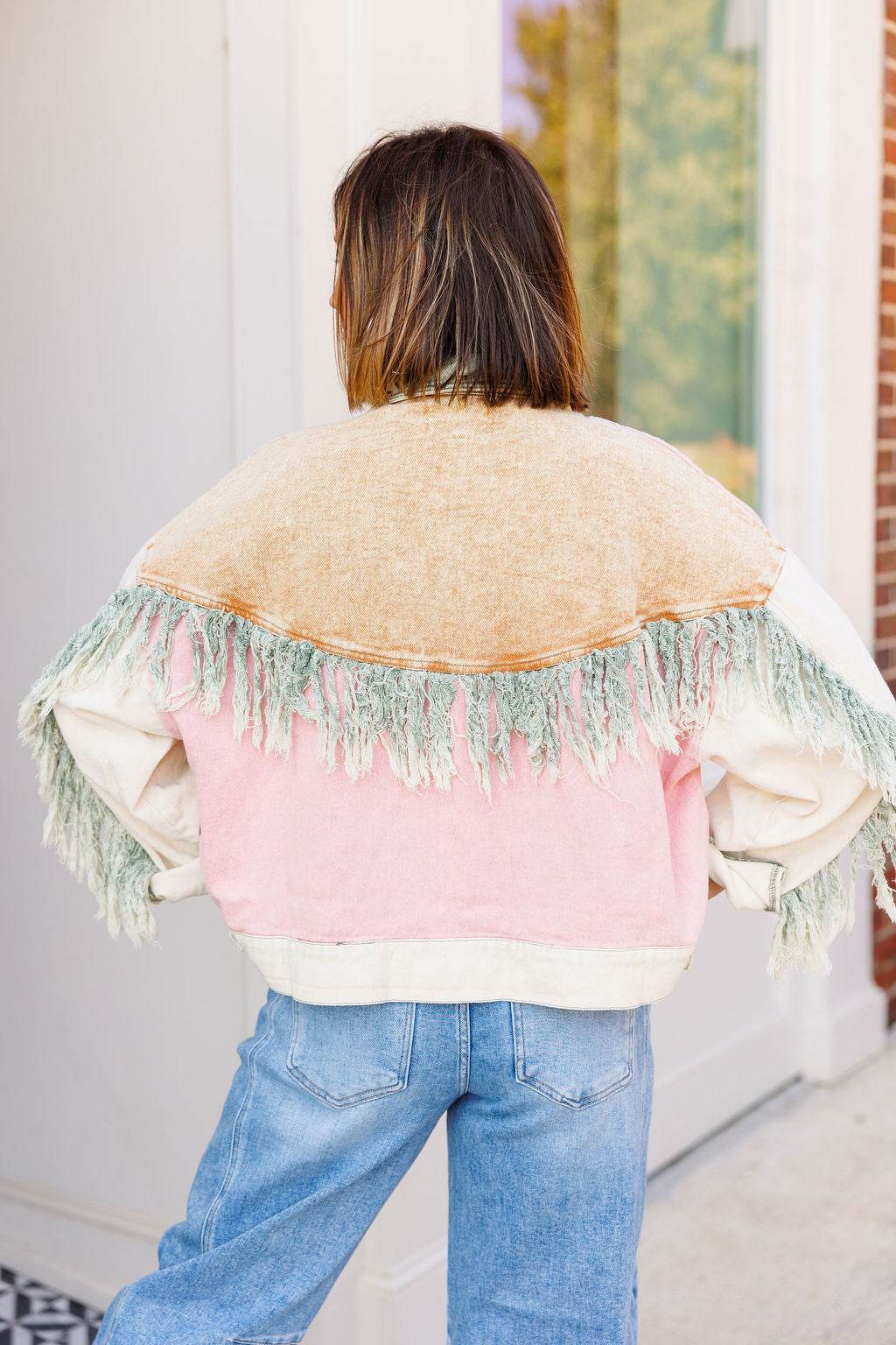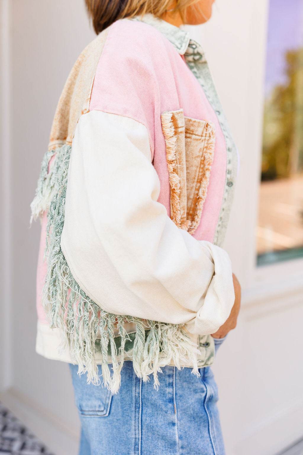 The Fringe Edit is a playful denim jacket showcasing a a one-of-a-kind color-blocked print and fringe accents. It includes two roomy front pockets with raw edges, a button-up front, and an adjustable hem featuring contrasting green tabs for a customizable fit. Don't miss this fun boho meets western piece.