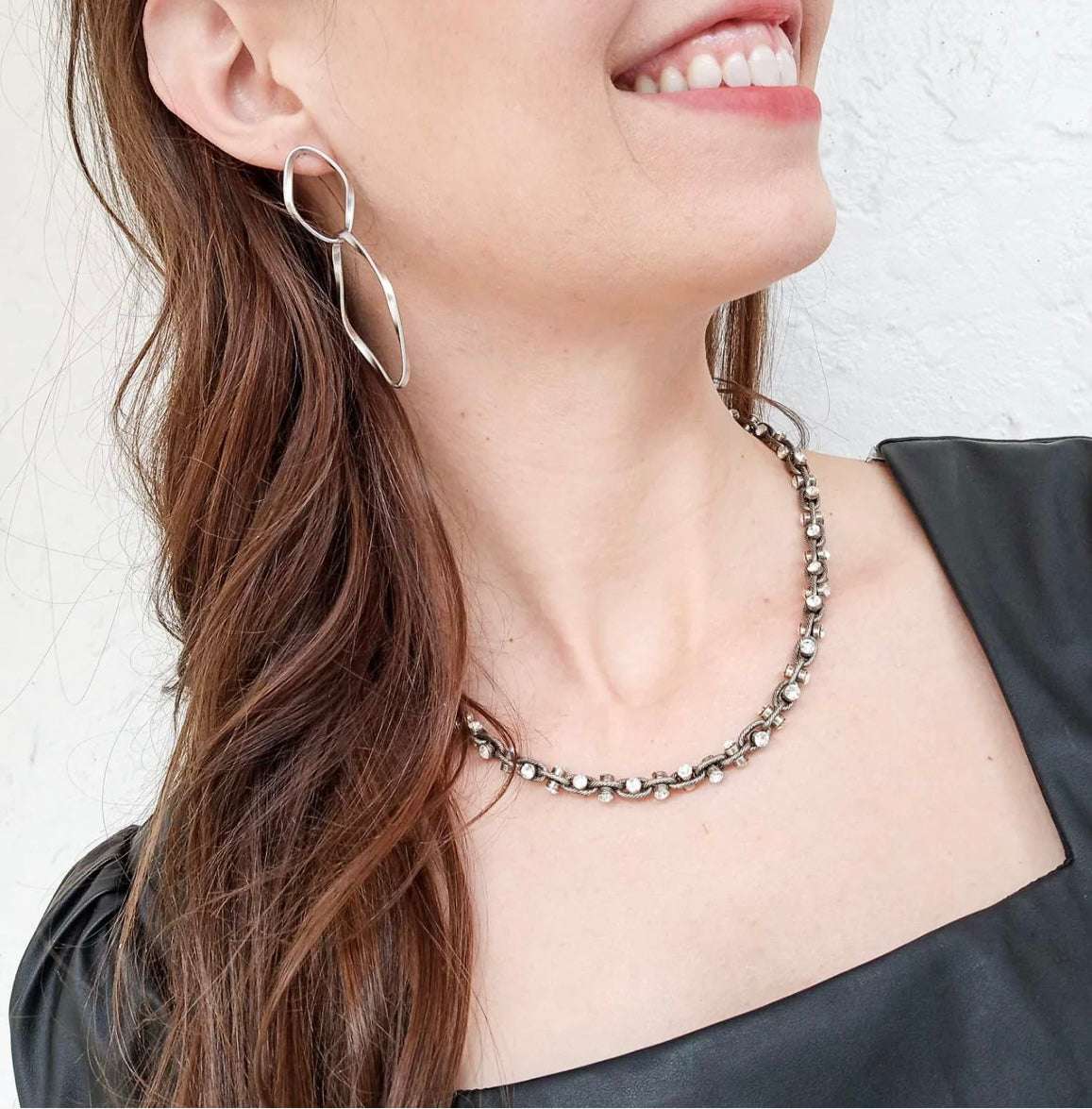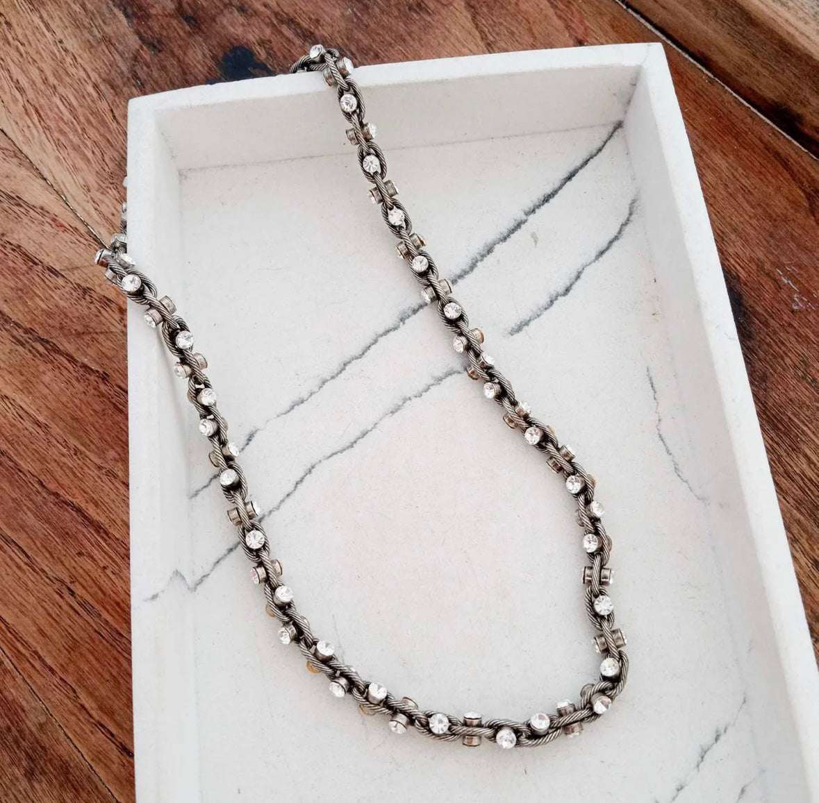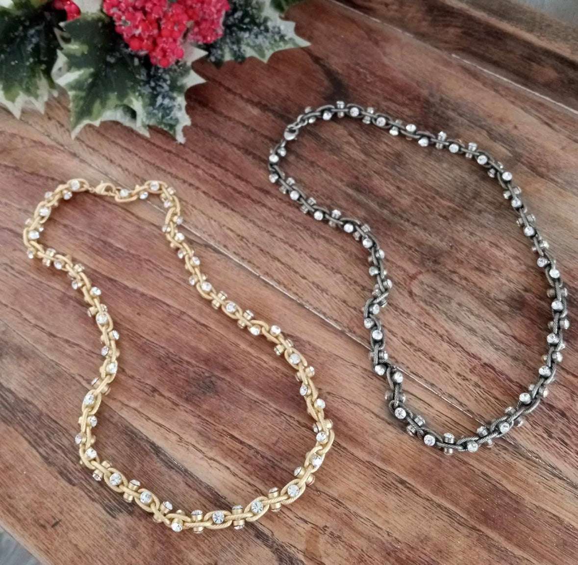 Elevate your style with this stunning solid brass 18” necklace Twisted Rhinestone Statement Necklace. Layer with other necklaces or wear alone for a simple statement.