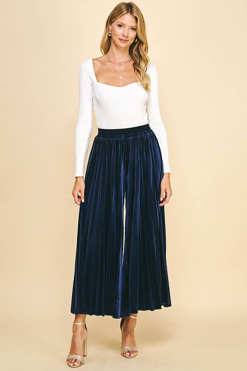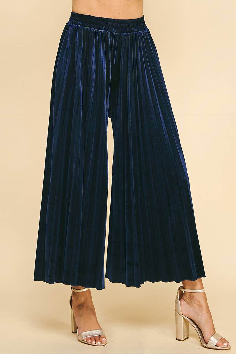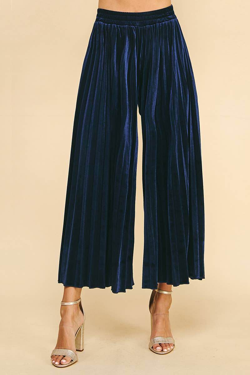 Unleash your inner glam with these Glamour Galore Velvet Pants in navy. Featuring a flattering pleated design, comfortable elastic waistband, and flowy wide leg, you'll feel like a runway model in no time.